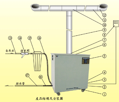 1)加濕機(jī)主機(jī) 2)電源線插座(AC220V) 3)濕度傳感器插座(四芯航空插座) 4)保險(xiǎn)絲座 5)控制面板 6)主機(jī)頂蓋 7)噴霧口 8)濕度傳感器 9)氣道管(PVC管,長度小于3米,自備) 10)三通(PVC,自備) 11)氣道管(PVC,長度小于7米,自備) 12)彎頭(PVC,自備) 13)供水管(4分,自備) 14)進(jìn)水閥(4分,自備) 15)水質(zhì)過濾器(10寸,10U) 16)進(jìn)水軟管(4分,自備) 17)排水管(6分,自備) 18)排水軟管(6分,自備) |