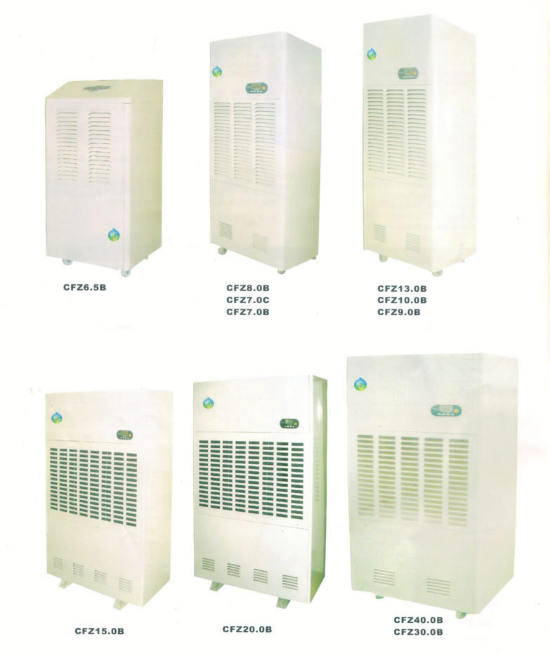 本產(chǎn)品為冷凍抽濕。風扇抽入潮濕空氣,通過冰凍的蒸發(fā)器凝結成水,匯集容器內(nèi)或經(jīng)水管引流排走。干真空氣經(jīng)冷凝器由出風口排走,濕度逐漸下降。